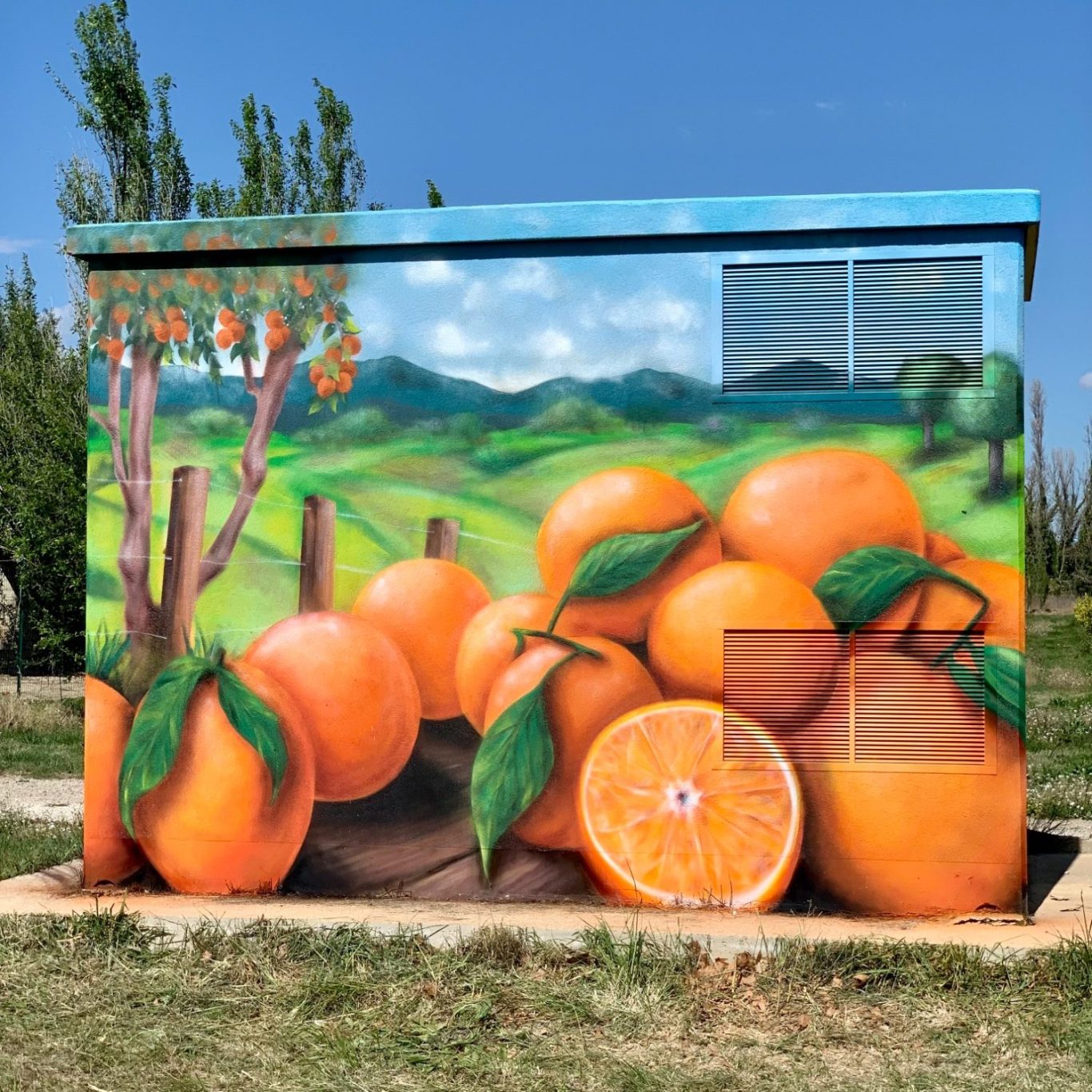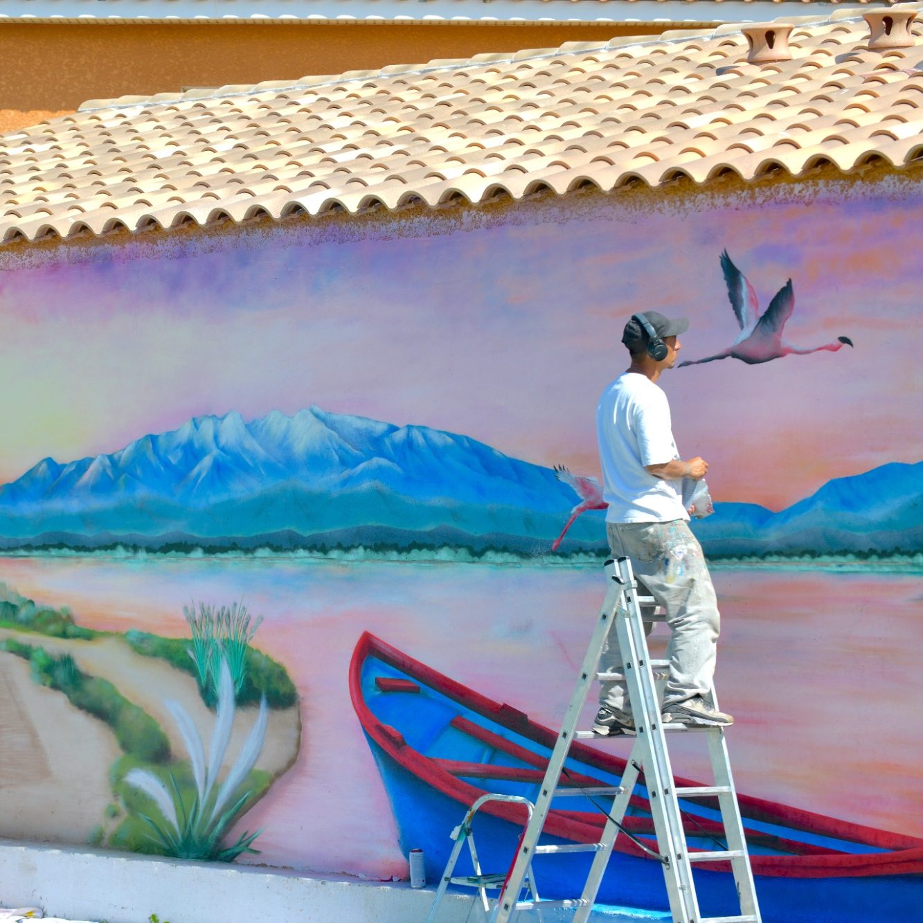 La fresque est réalisée directement sur place avec des techniques mixtes (spray, acrylique, pinceau).